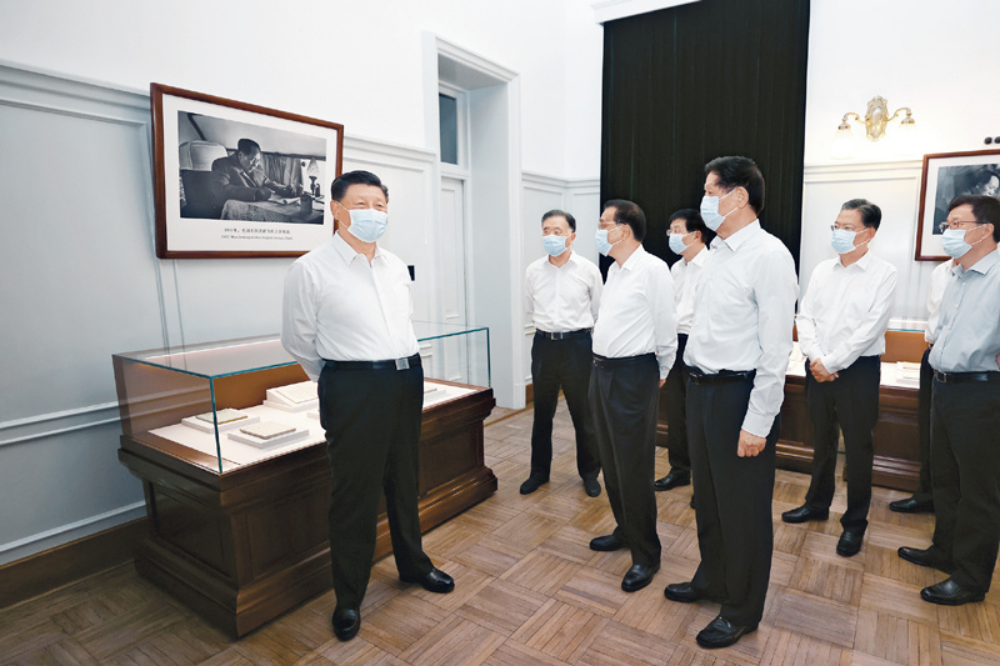 2021年6月25日,中共中央政治局就用好红色资源、赓续红色血脉举行第三十一次集体学习。这次集体学习采取参观和讨论相结合的形式,这是习近平、李克强、栗战书、汪洋、王沪宁、赵乐际、韩正等在北大红楼参观“光辉伟业 红色序章——北大红楼与中国共产党早期北京革命活动主题展”。 新华社记者 谢环驰/摄
